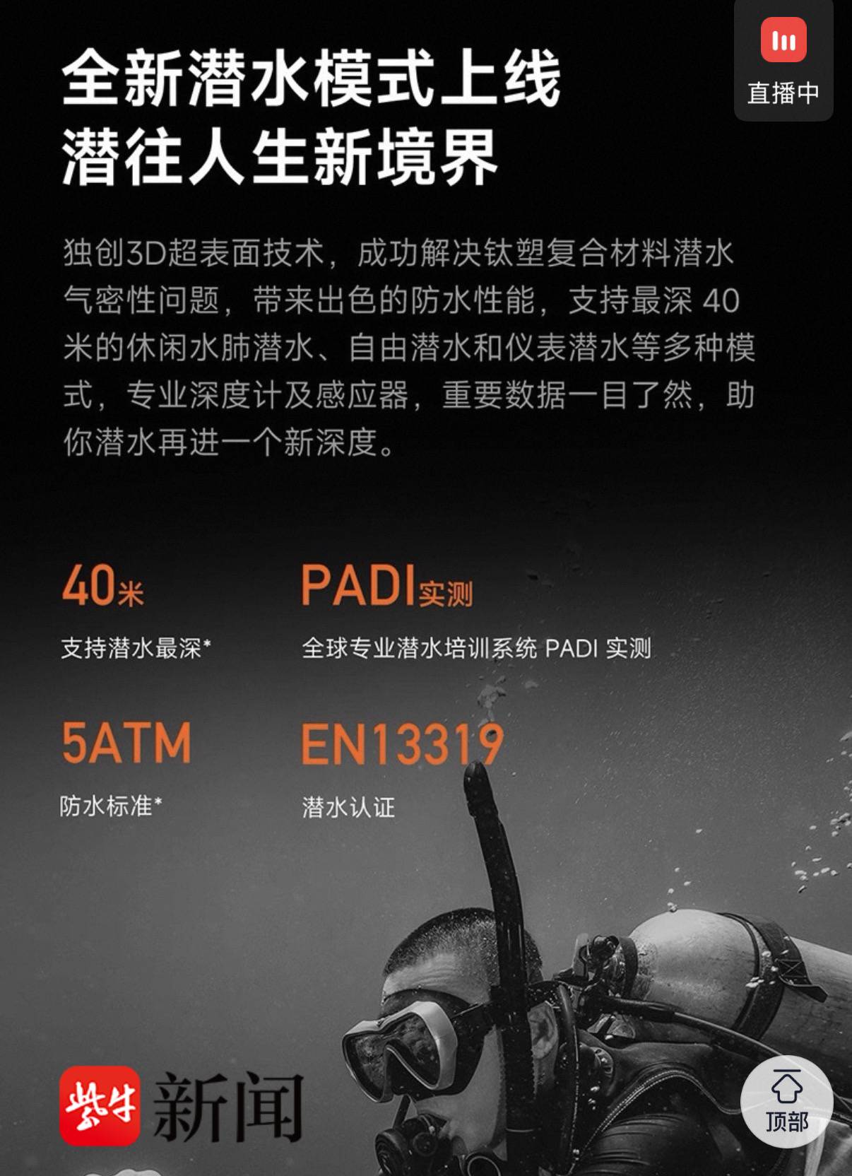 他认为此款表存在多处严重虚假宣传的情形,因此将小米通讯技术有限公司作为被告之一告上了法庭。起诉书中提及,小米官网介绍该款手表有全新潜水模式,独创 3D 超表面技术,成功解决钛塑复核材料潜水气密性问题, 带来出色的防水性能,支持最深40 米的休闲水肺潜水、自由潜水和仪表潜水等多种模式;并且重点提及:1、支持40米潜水;2、PADI 实测;3.5ATM 防水标准;4、有EN13319 潜水认证。