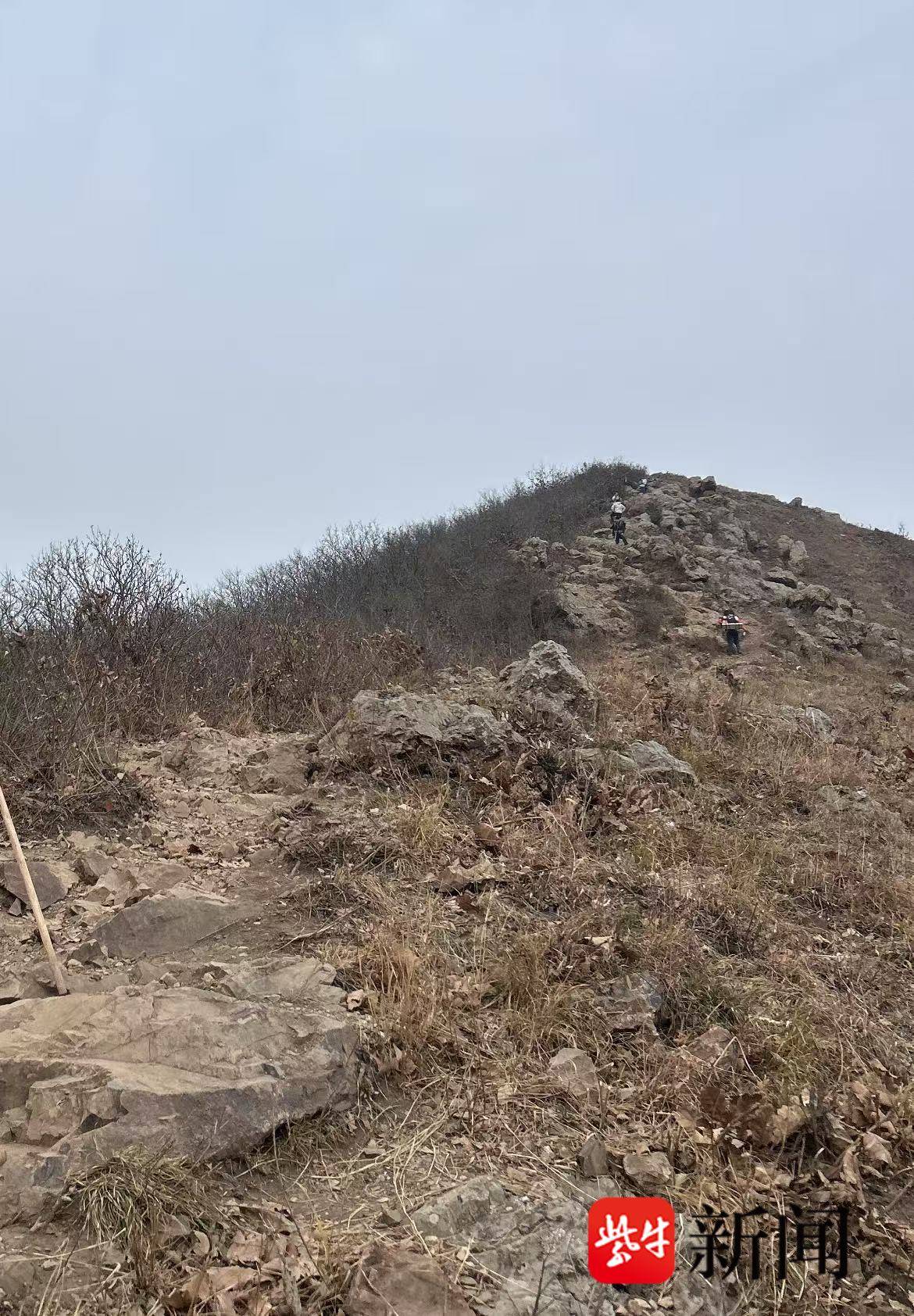 后来,记者也攀爬到这一段发现,这里十分陡峭,怪石嶙峋,人们走过的“脚窝”也很滑。山道位于山脊,山阴全是灌木,人无法钻入,山南侧全是杂草碎石、尖刺,在陡峭路段只能手脚并用。
