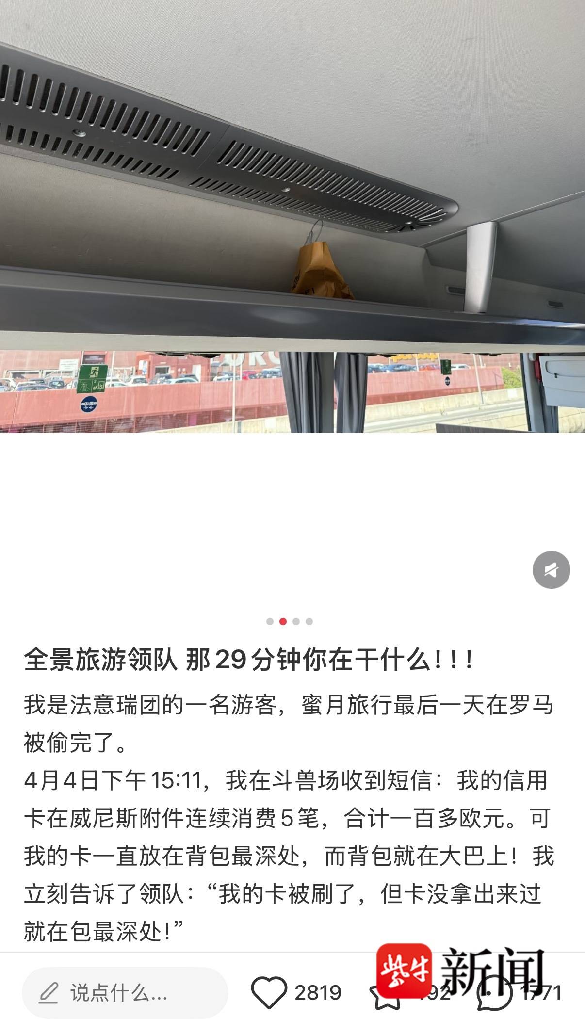 小新回忆,失窃发生在行程最后一天的下午。当天15时许,旅行团游客们正在罗马斗兽场游览,她突然收到信用卡消费短信通知,显示其信用卡在威尼斯附近有多笔连续消费,合计一百多欧元。小新称,这张备用卡一直放在背包深处,而背包当时放在旅行团大巴上,她当即向领队反映了这一情况。不过,领队听到后并未立即联系司机或通知旅行团返回,而是继续带队游览。直到约半个小时后,领队接到司机打来电话,称大巴车门被打开、行李可能被盗。