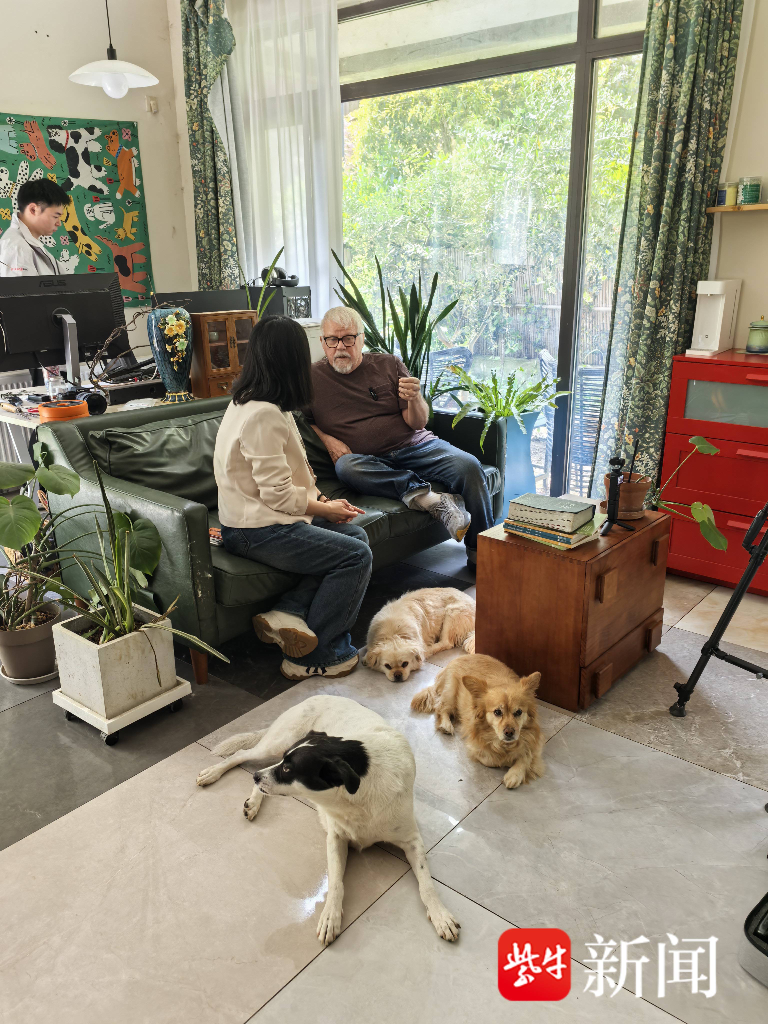 来到“汉字叔叔”的家,这里收拾得很清爽,进门就是一张工作台,一块黑板,上面还用粉笔写了几个汉字。一旁的书橱里塞满了书籍,显眼处都是关于汉字的中文词典。他把家里的小院种上了花草,四月里,花草树木郁郁葱葱。小院里还摆了一张大躺椅,可以随时晒太阳看书、小憩,这里仿佛是“汉字叔叔”的“世外桃源”。