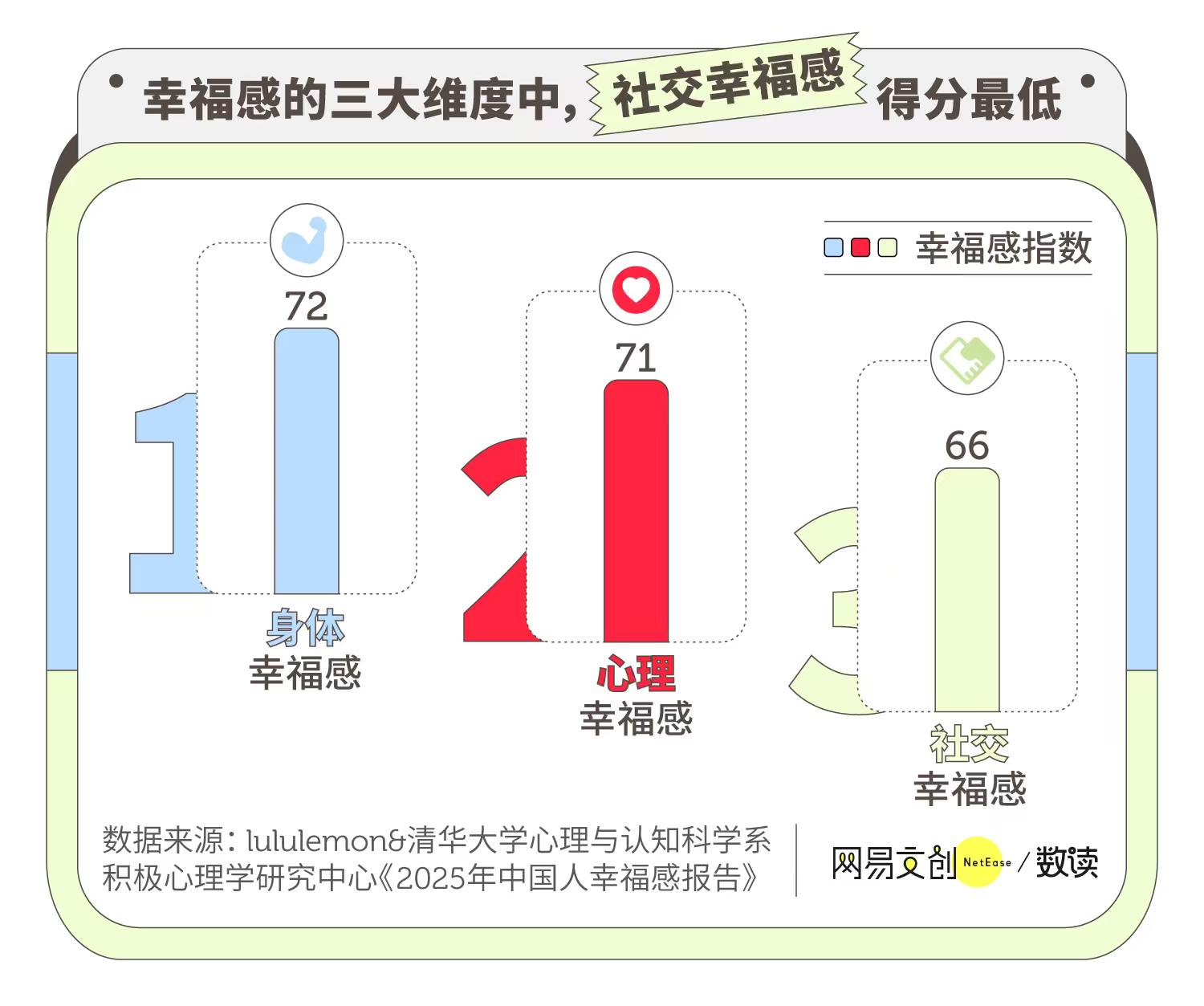 报告数据显示,中国人的社交幸福感得分(66分)显著低于身体幸福感(72分)和心理幸福感(71分),仅有24.3%的受访者将社交幸福感放在首位。