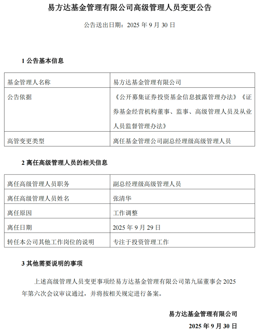 9月29日晚间,易方达基金公告称,因工作调整,张清华不再担任副总经理级高级管理人员职务,将专注于投资管理工作,离任日期为2025年9月29日。