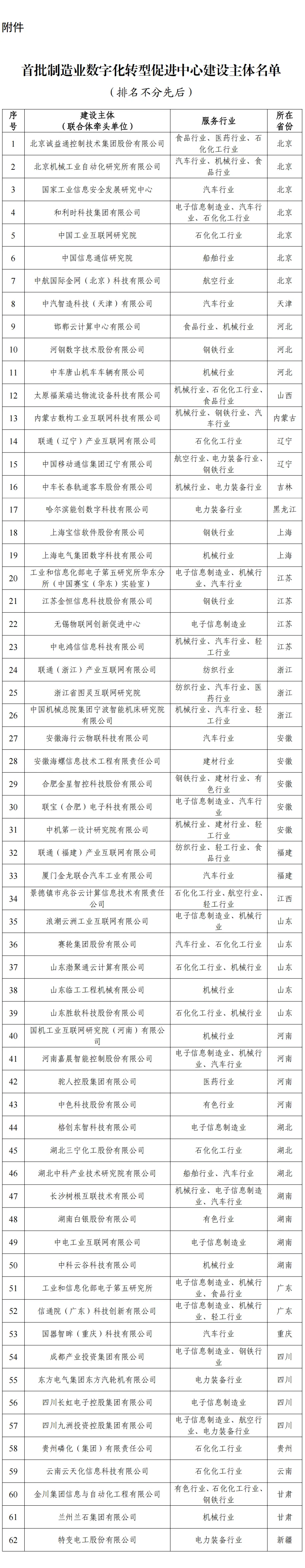 根据《工业和信息化部办公厅关于开展2025年制造业数字化转型促进中心建设工作的通知》(工信厅规函〔2025〕248号),经建设主体申报、地方推荐、专家评审、公示等程序,共有62家单位进入首批制造业数字化转型促进中心建设主体名单,现予以公布。