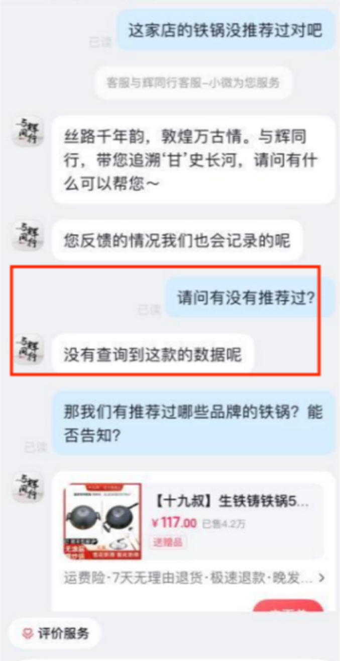 体验调查中,点击小红书上“与辉同行-厨房用品”账号(现账号名字已经更改为“小红薯68****32”),主页均是某知名主播推荐铁锅的视频,“上线3分钟卖了一万单”“上架五分钟热卖3万多单”等宣传内容,然而,体验人员向其官方客服确认,发现视频下方挂的链接并非其推荐的品牌和店铺,相关主播并未推荐过该网店商品。