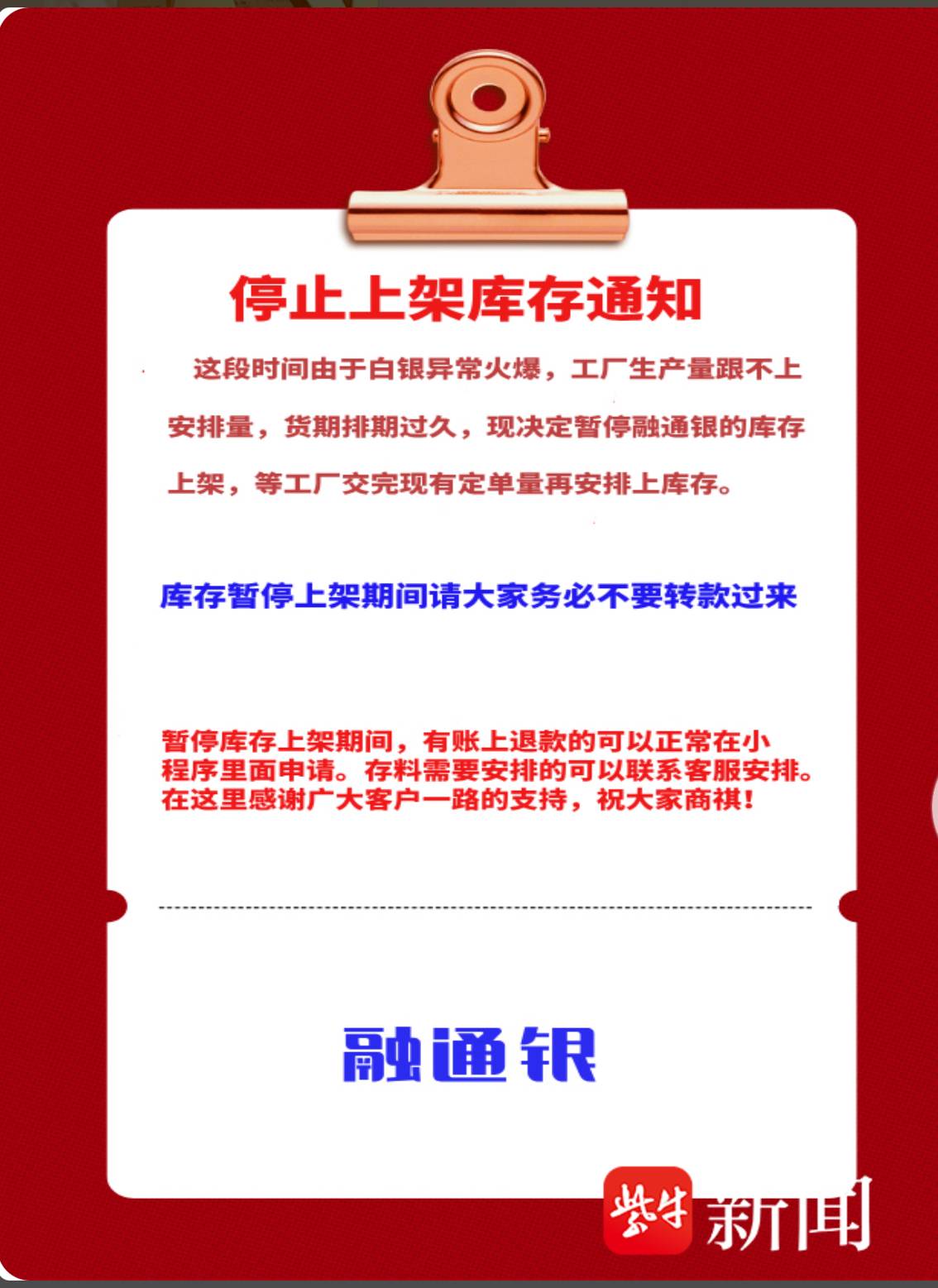 黄金价格上涨也带动白银的价格走势,今日白银现货价格为12.17元/克。白银实时销售的小程序——融通银已发布的《停止上架库存的公告》显示:“这段时间由于白银异常火爆,工厂生产量跟不上安排量,货期排期过久,现决定暂停融通银的库存上架,等工厂交完现有订单量再安排上库存。库存暂停上架期间,请大家务必不要转款过来。”