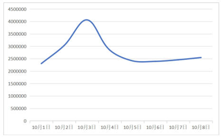 8天监测期内,共收集到“消费维权”相关信息21923881条,日均约274万条。10月3日信息量达到峰值,为4060819条。