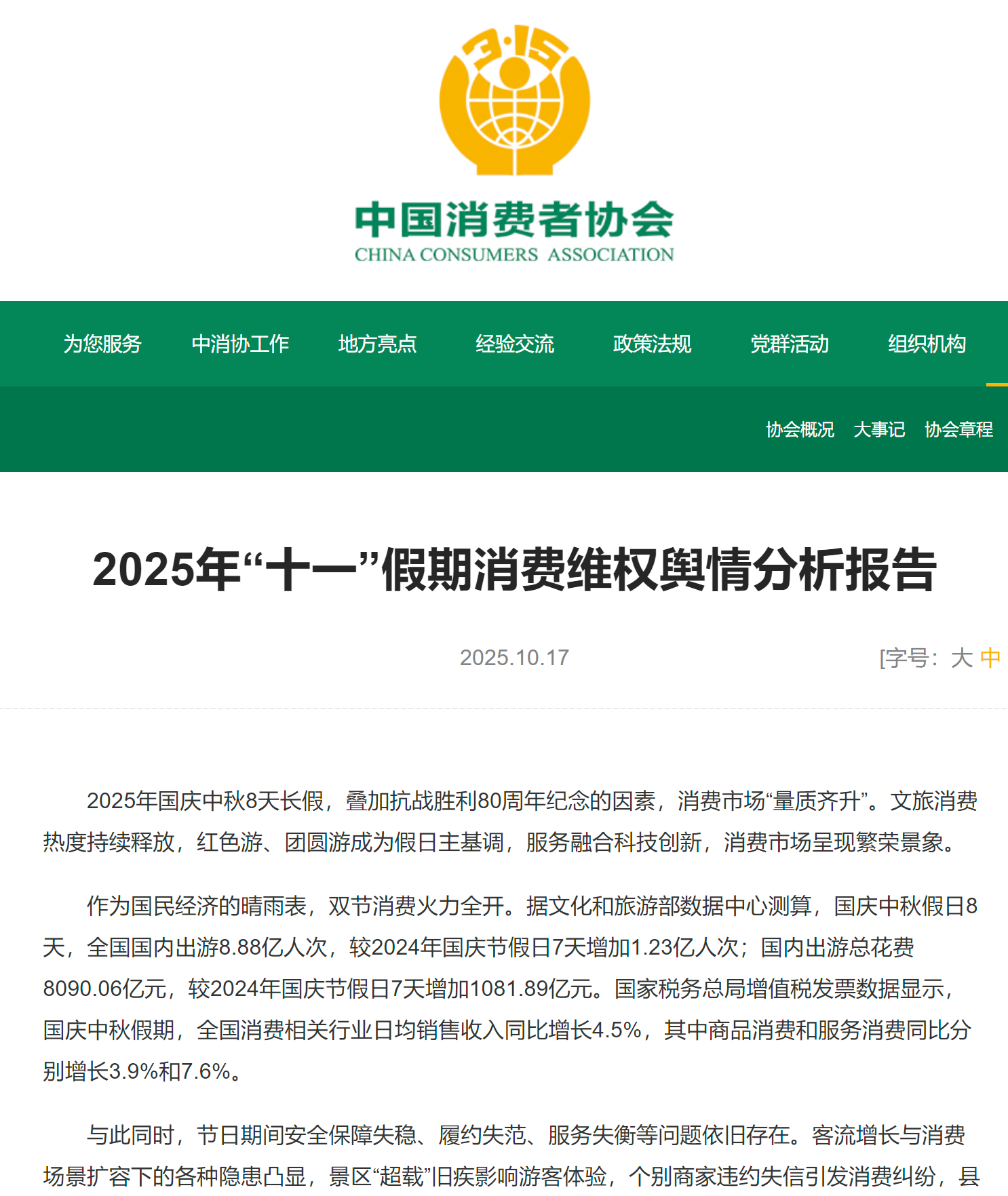 据中消协官网,10月17日,中消协发布《2025年“十一”假期消费维权舆情分析报告》(简称《报告》)。在10月1日至10月8日共收集到“消费维权”相关信息21923881条,日均约274万条;数据显示,住宿维权、安全管理、景区服务等方面话题热度较高。