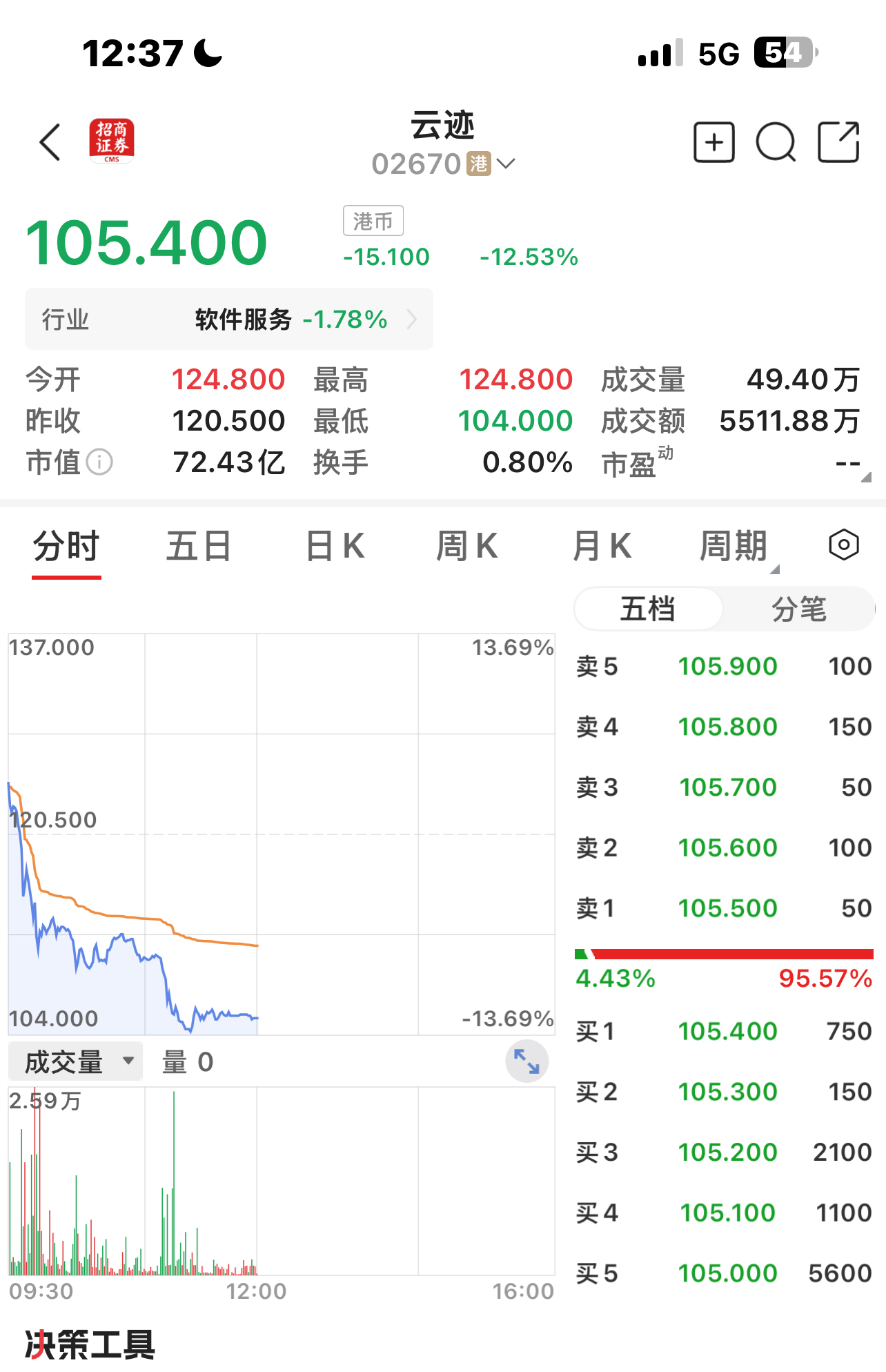 17日,云迹科技以124.8港元/股开盘,市值72.43亿港元。