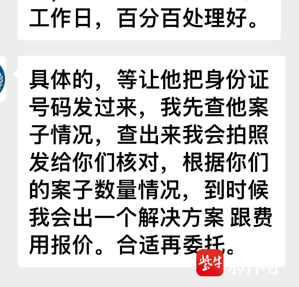 “具体的,等你把身份证号码发过来,我先查你们案子情况,查出来我会拍照发给你们核对,根据你们的案子数量情况,到时候我会出一个解决方案跟费用报价。合适再委托。”