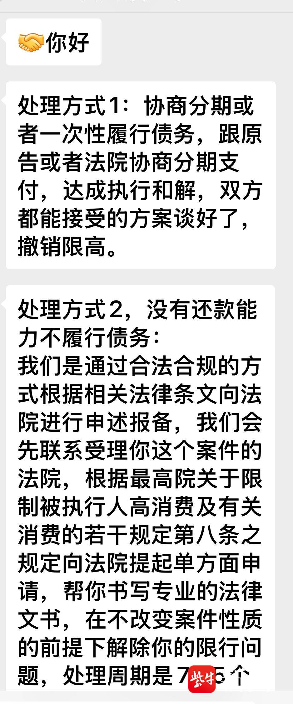 网名“天道酬勤”的“律师”线上给记者留言,“处理方式1:协商分期或者一次性履行债务,跟原告或者法院协商分期支付,达成执行和解,双方都能接受的方案谈好了,撤销限高。