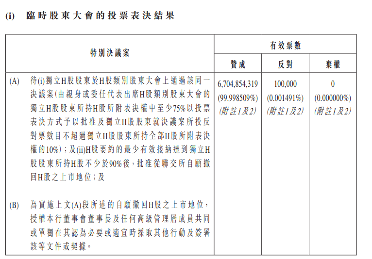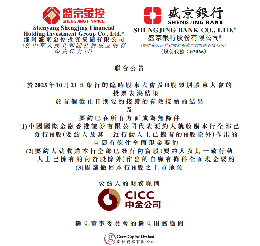 10月21日,港股上市的盛京银行发布公告称,当日,该行临时股东大会及H股类别股东大会以超过99.99%的赞成率表决通过了该行H股要约及退市相关议案。