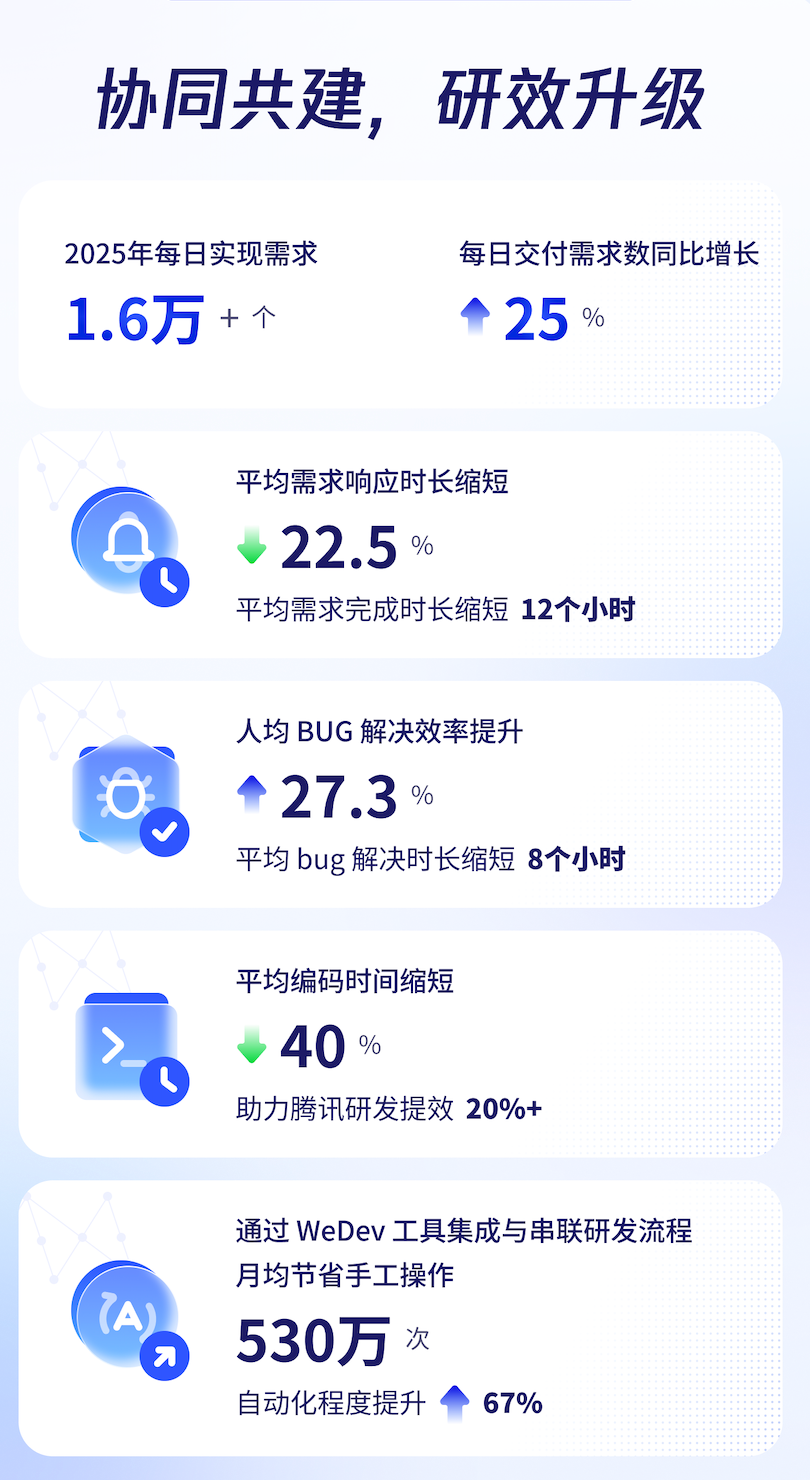 AI的落地离不开好用的研效平台。报告指出,随着WeDev研效融合和智能化深入研发实践,研效工具间每日数据互通8000万+次 ,平台月均节省手工操作530万次,自动化程度同比提升67%。