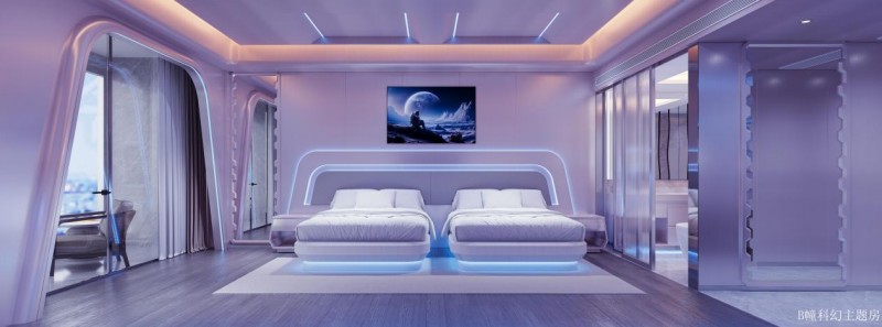 另一大特色的科幻主题亲子房,则通过声光电技术打造沉浸式科幻体验:室内营造出科幻场景,仿佛穿越至未来的星际空间站,让孩子在入住瞬间就进入科幻冒险世界。