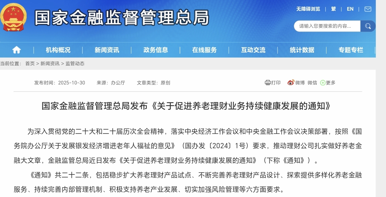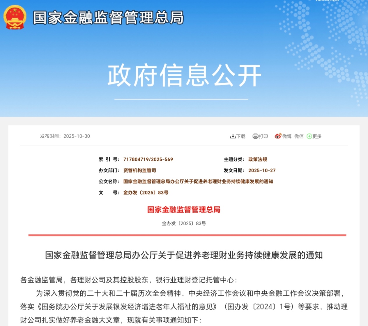 扬子晚报网10月30日讯(记者 马燕)10月30日,金融监管总局官网信息显示,金融监管总局近日发布《关于促进养老理财业务持续健康发展的通知》(简称《通知》)。