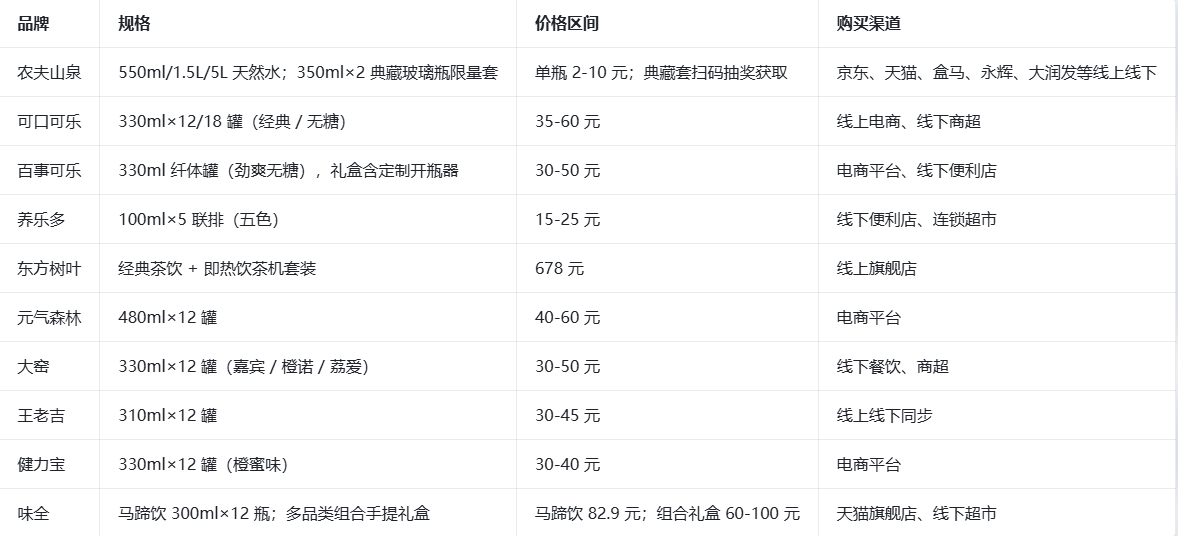 另一方面,规格与组合极具场景适配性:农夫山泉提供从550ml到5L的全规格家庭囤货装及典藏玻璃瓶;味全推出多品类组合的“马上有好事”手提礼盒,适合走亲访友;元气森林等则聚焦年轻群体,推出便携时尚的罐装礼盒。这种“文化+规格”的双轮驱动,实现了对自饮、囤货、礼赠、收藏等需求的全面覆盖,彰显出市场的活力与创新力。