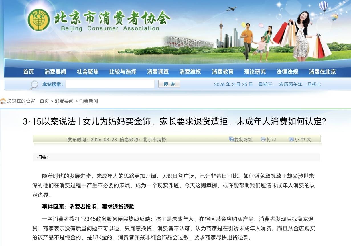 近日,北京市消协发布一则案例:孩子是未成年人,在辖区某金店购买产品,消费者发现后找商家退货,商家不给退。调解人员调查后发现:购买时孩子父亲在场,还在小票上签字确认。消费者要求退货的依据不充分。