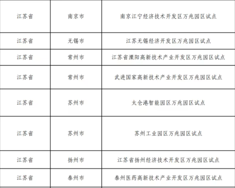 万兆园区试点项目为:南京江宁经济技术开发区万兆园区试点、江苏无锡经济开发区万兆园区试点、江苏省溧阳高新技术产业开发区万兆园区试点、武进国家高新技术产业开发区万兆园区试点、太仓港智能园区万兆园区试点、苏州工业园区万兆园区试点、江苏省扬州经济技术开发区万兆园区试点、泰州医药高新技术产业开发区万兆园区试点。