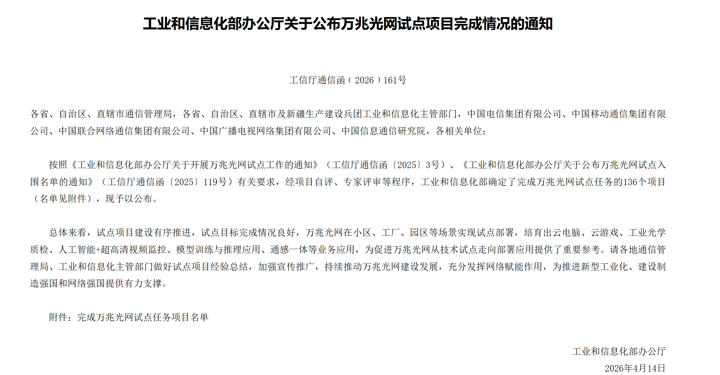 据《工业和信息化部办公厅关于公布万兆光网试点项目完成情况的通知》(工信厅通信函﹝2026﹞161号),总体来看,试点项目建设有序推进,试点目标完成情况良好,万兆光网在小区、工厂、园区等场景实现试点部署,培育出云电脑、云游戏、工业光学质检、人工智能+超高清视频监控、模型训练与推理应用、通感一体等业务应用,为促进万兆光网从技术试点走向部署应用提供了重要参考。