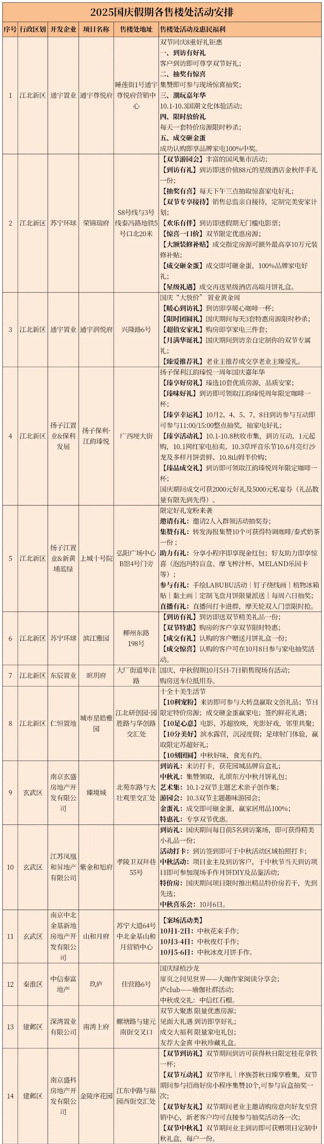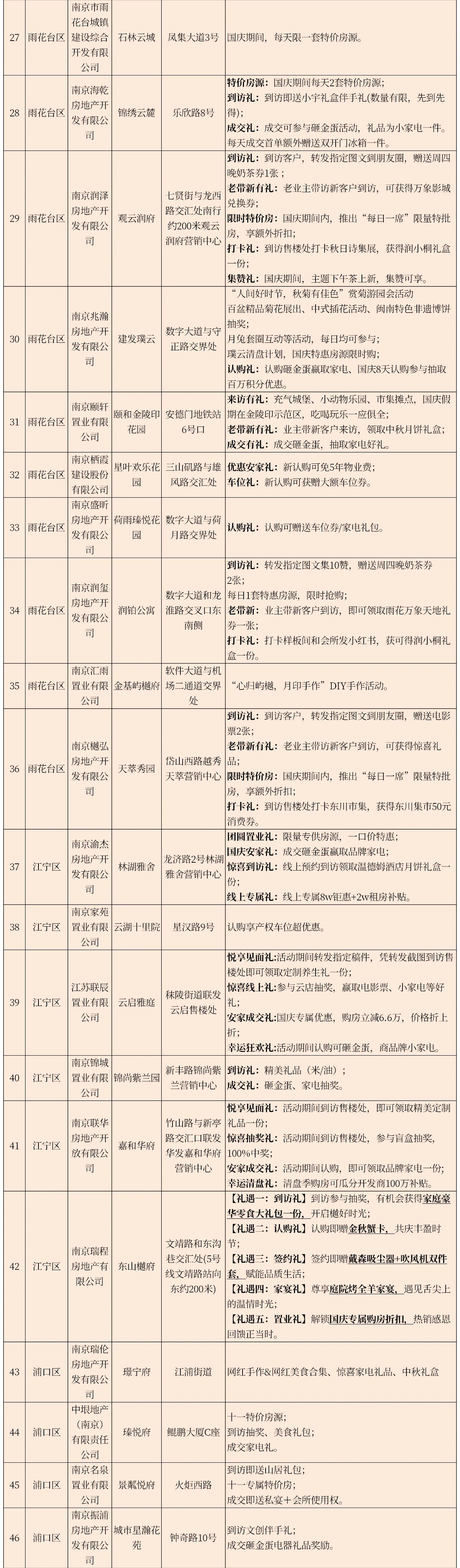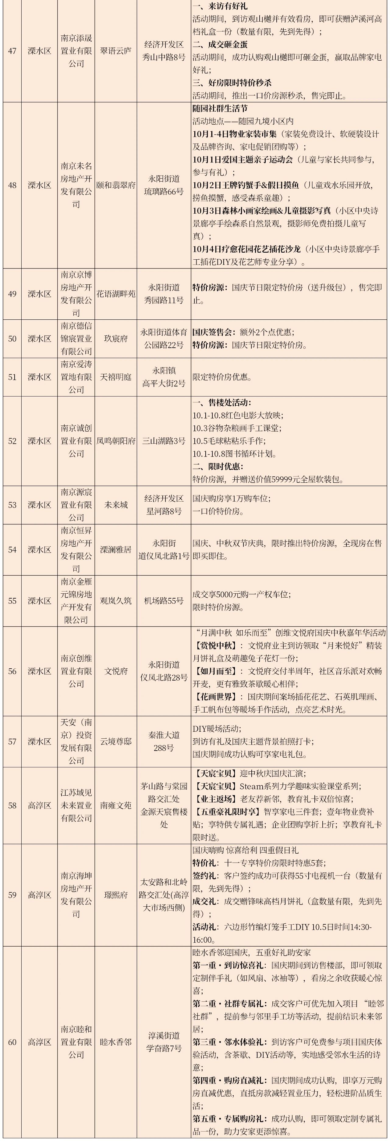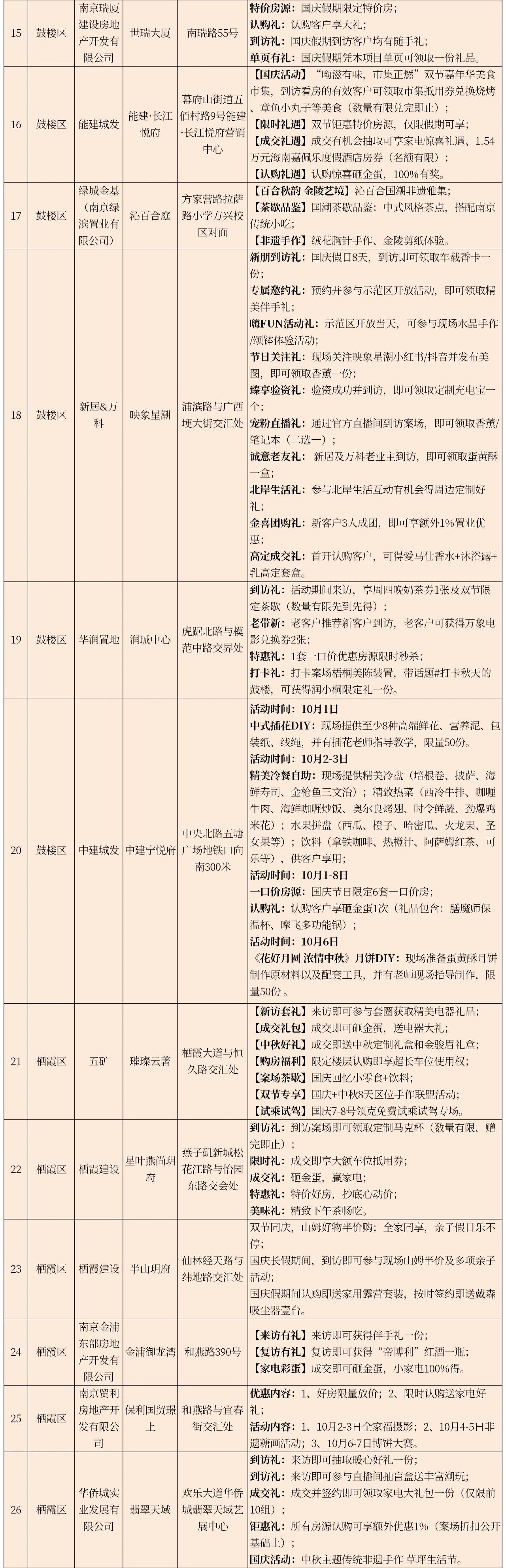 这60家楼盘位于南京全市各个板块,包括江北新区、玄武区、秦淮区、鼓楼区、栖霞区等,房源数量多、覆盖面广、类型丰富,可以全方位满足刚性和改善性的多层次住房需求。以江北新区的通宇尊悦府为例,国庆期间推出了8重好礼优惠,如到访有好礼、抽奖有惊喜、潮玩嘉年华、限时放价礼等,每天将推出一套特价房限时秒杀,成功认购者还可享品牌家电100%中奖。鼓楼区的映象星潮推出团购礼,新客户3人成团的,可享受1%的置业优惠。栖霞区的翡翠天域在国庆期间对所有房源推出额外1%的优惠,成交客户还可领取家电大礼包。此外,多家楼盘还推出中秋月饼DIY、美食集市、非遗文创手工和国风园艺会等活动,溧水区则开展了咪豆音乐节“房产+文旅”推介系列活动。