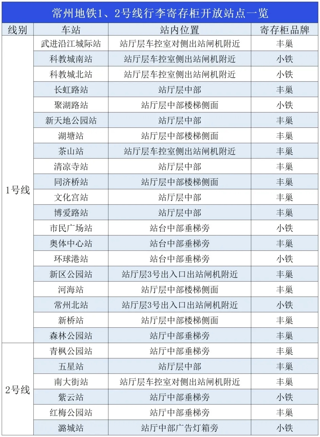 假期出行不想大包小包?这些地铁站点可以寄存行李,帮您轻松“减负”!特别提醒:行李寄存柜均位于车站付费区内,乘客需首先通过安检进站后,方可进行寄存;乘客寄存的行李物品须符合常州地铁安检要求,严禁寄存易燃、易爆、有毒等违禁和限制物品;行李寄存服务时间与车站运营时间同步,仅在当日当站运营时间段内提供寄存保管服务,不超过当站末班车时间。请乘客留意车站首末班车时间。