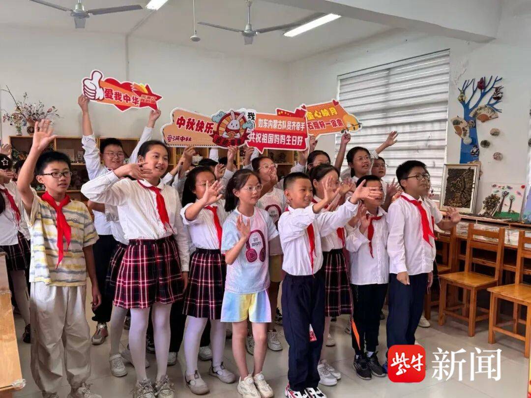一根网线,串起大海与草原,也将两地童心紧紧相连。屏幕这端,九总小学的少先队员们精神饱满、整齐端坐,黑板上“浓情中秋 欢庆国庆”“蒙汉一家亲”的主题绘画色彩鲜明;另一端,内蒙古自治区呼和浩特市土默特左旗回族小学的少先队员们身着特色民族服饰,隔着屏幕挥手致意,笑容灿烂。他们面前的桌案上,摆满了月饼、葡萄、苹果等象征团圆的美食,教室里处处洋溢着浓郁的节日氛围。