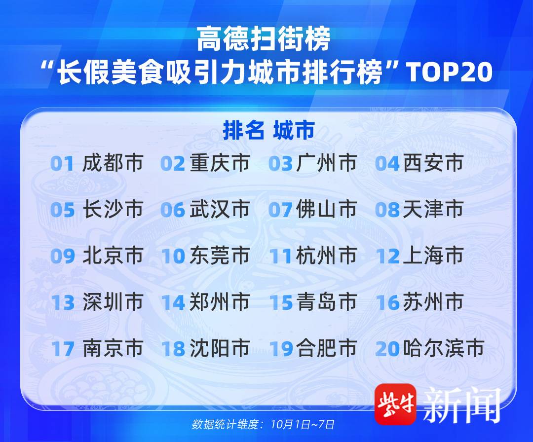 “好玩又好吃”成为广大游客出行决策的新标准,高德扫街榜数据显示,全国《长假美食吸引力城市排行榜》的前20名依次是:成都、重庆、广州、西安、长沙、武汉、佛山、天津、北京、东莞、杭州、上海、深圳、郑州、青岛、苏州、南京、沈阳、合肥、哈尔滨。