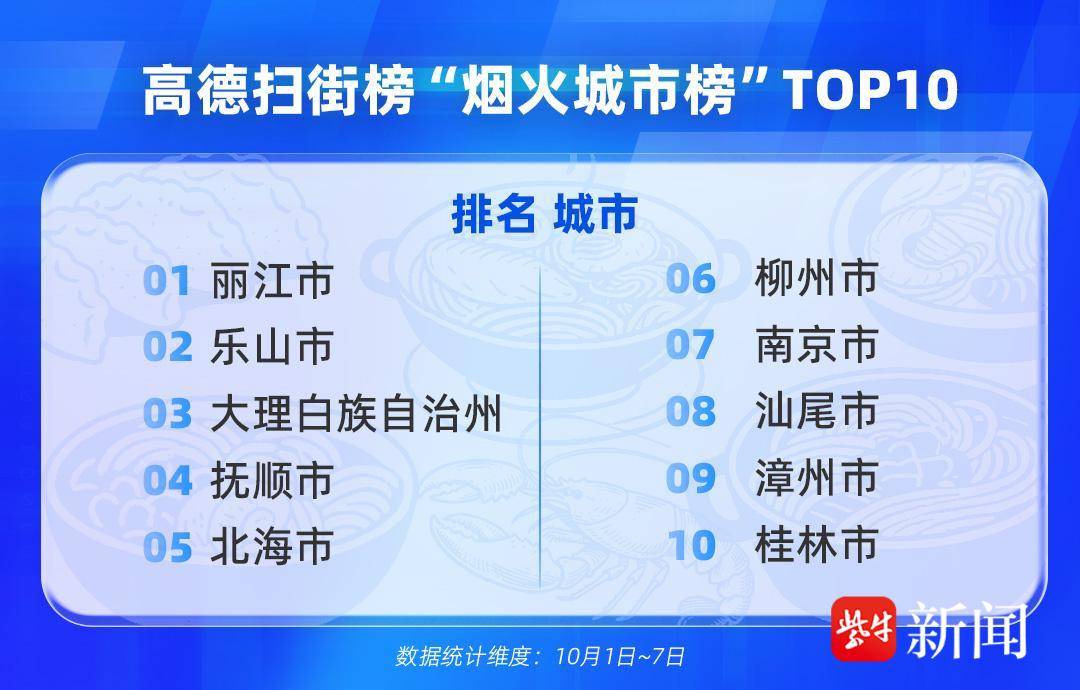 10月1日-7日,高德扫街榜“烟火城市榜”的前10名依次是:丽江、乐山、大理、抚顺、北海、柳州、南京、汕尾、漳州和桂林。