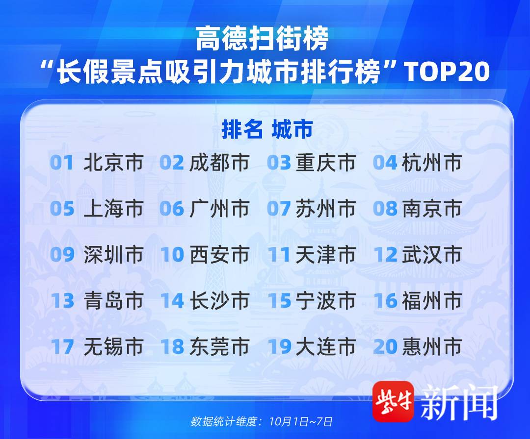 全国《长假景点吸引力城市排行榜》的前20名依次是:北京、成都、重庆、杭州、上海、广州、苏州、南京、深圳、西安、天津、武汉、青岛、长沙、宁波、福州、无锡、东莞、大连、惠州,均为一线和二线城市。
