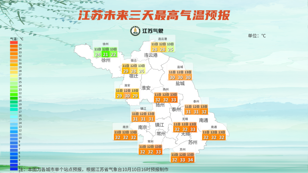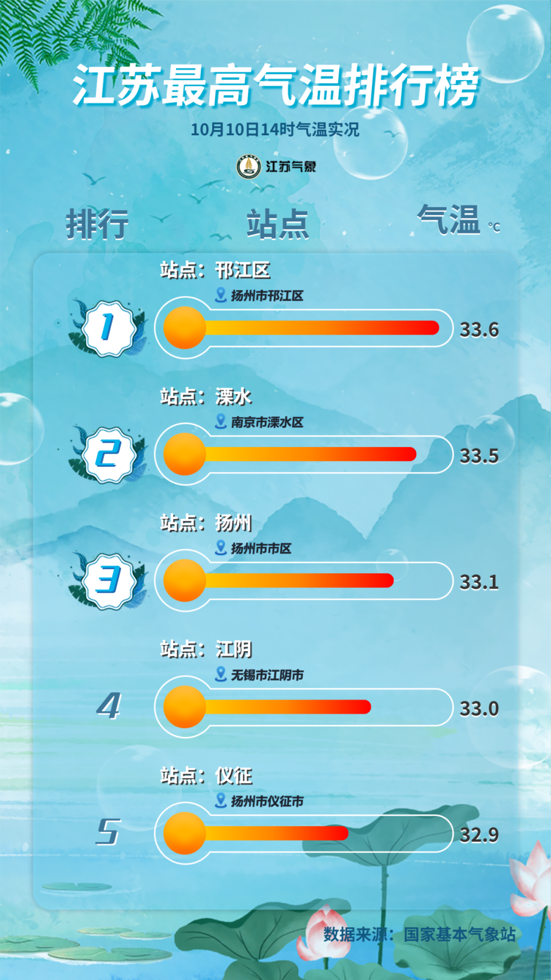 10日下午江苏14时的气温,南北部城市有较明显差异,淮北地区温度普遍较低,徐州部分地区只有15℃上下,秋意渐浓。沿江苏南地区秋老虎盛行,气温普遍在30℃以上。其中扬州市邗江区温度最高,达到了33.6℃。