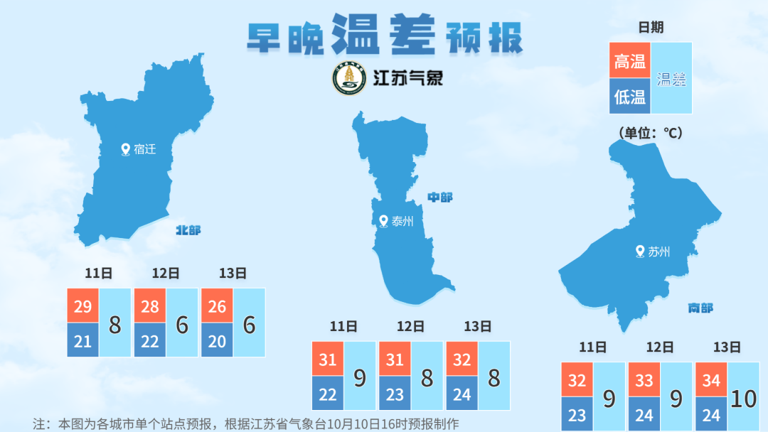 要特别注意的是,未来三天,全省早晚温差普遍较大,特别是中部和南部城市,像泰州和苏州市早晚温差达到了8到9℃,大家要注意及时增减衣物,谨防感冒。