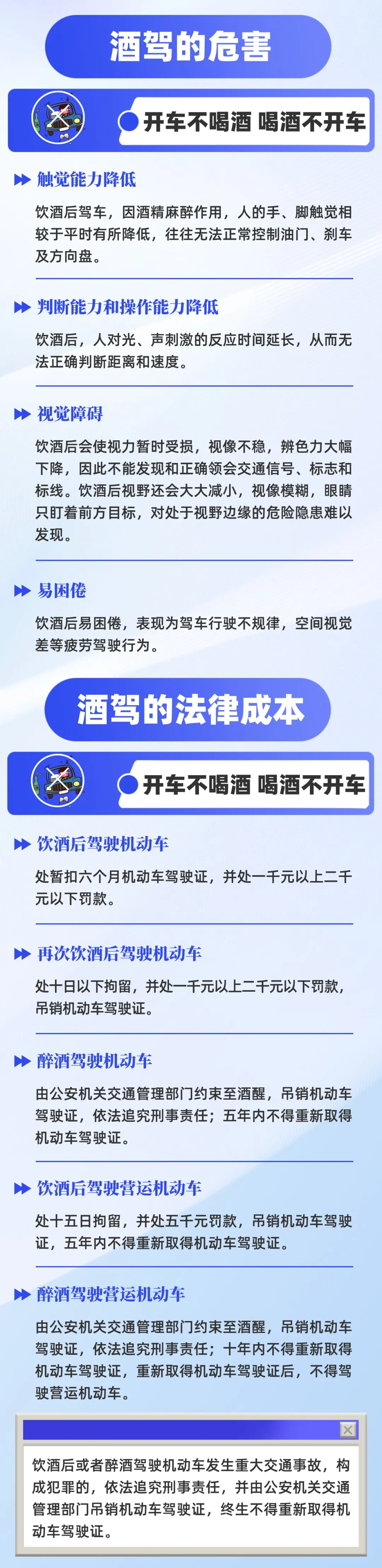 酒驾危害猛于虎,莫拿侥幸当幸运!周末聚餐,请务必守好安全红线,切勿酒驾醉驾,谨记:生命无价,酒后禁驾!为了您和他人的生命财产安全,请自觉抵制、主动劝阻酒醉驾等违法犯罪行为。