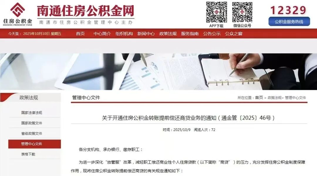 近日,南通市住房公积金管理中心发布《关于开通住房公积金转账提前偿还商贷业务的通知》,进一步深化“放管服”改革,充分发挥住房公积金制度保障作用,切实减轻职工偿还商业性个人住房贷款的经济压力。