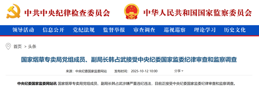 据中央纪委国家监委网站:国家烟草专卖局党组成员、副局长韩占武涉嫌严重违纪违法,目前正接受中央纪委国家监委纪律审查和监察调查。