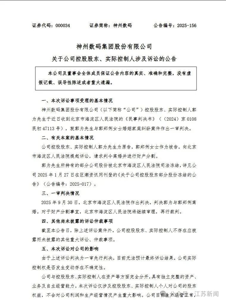 10月10日深夜,神州数码(000034.SZ)发布公告,披露了公司控股股东、实际控制人郭为离婚案的一审判决结果。