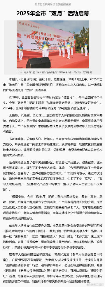金秋十月,暖意融融。10月11日上午,2025年全市“敬老月”暨“养老服务消费促进月”活动在镇江市南山北入口启动,以一场精彩的广场活动拉开“双月”活动序幕。