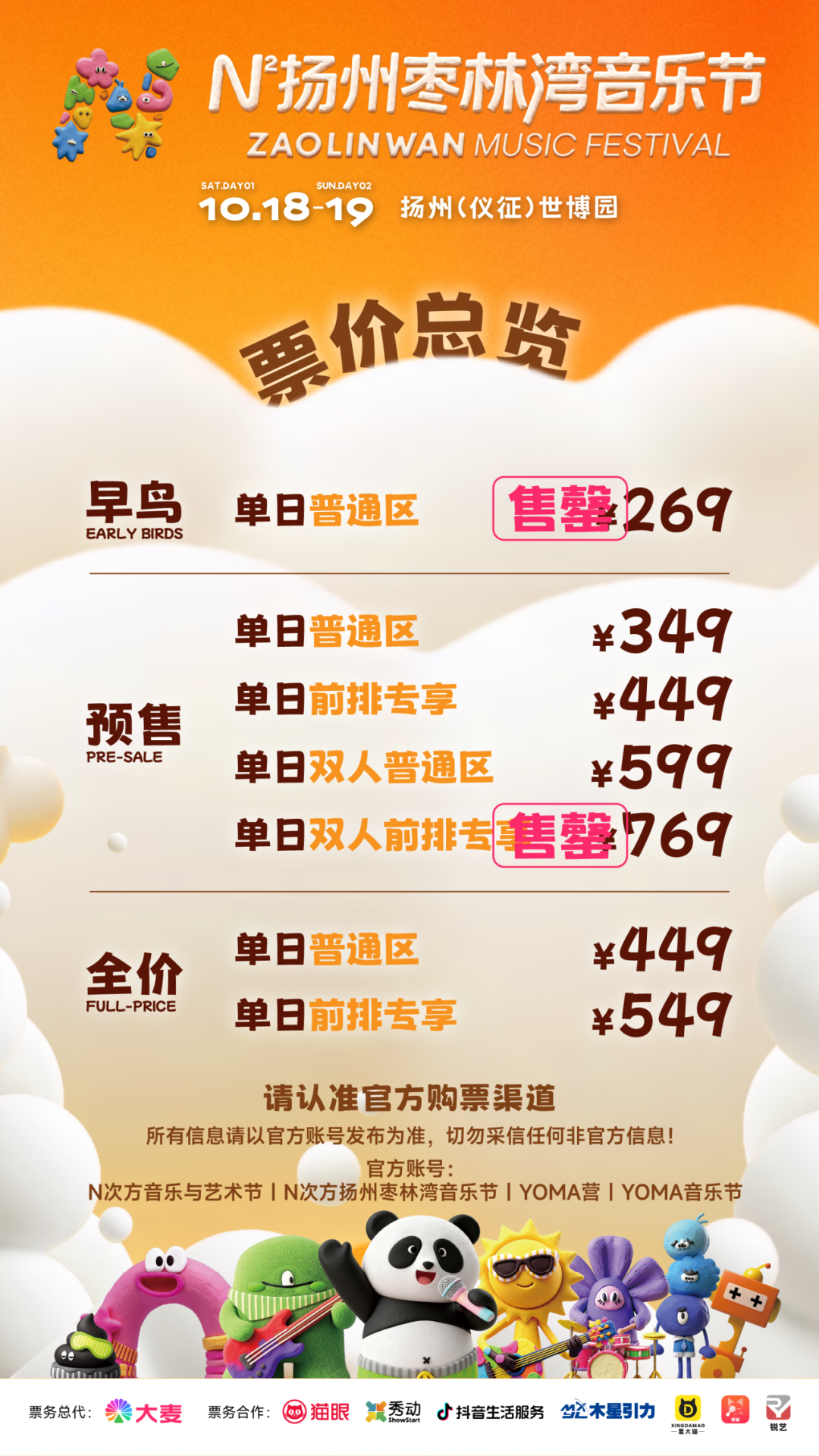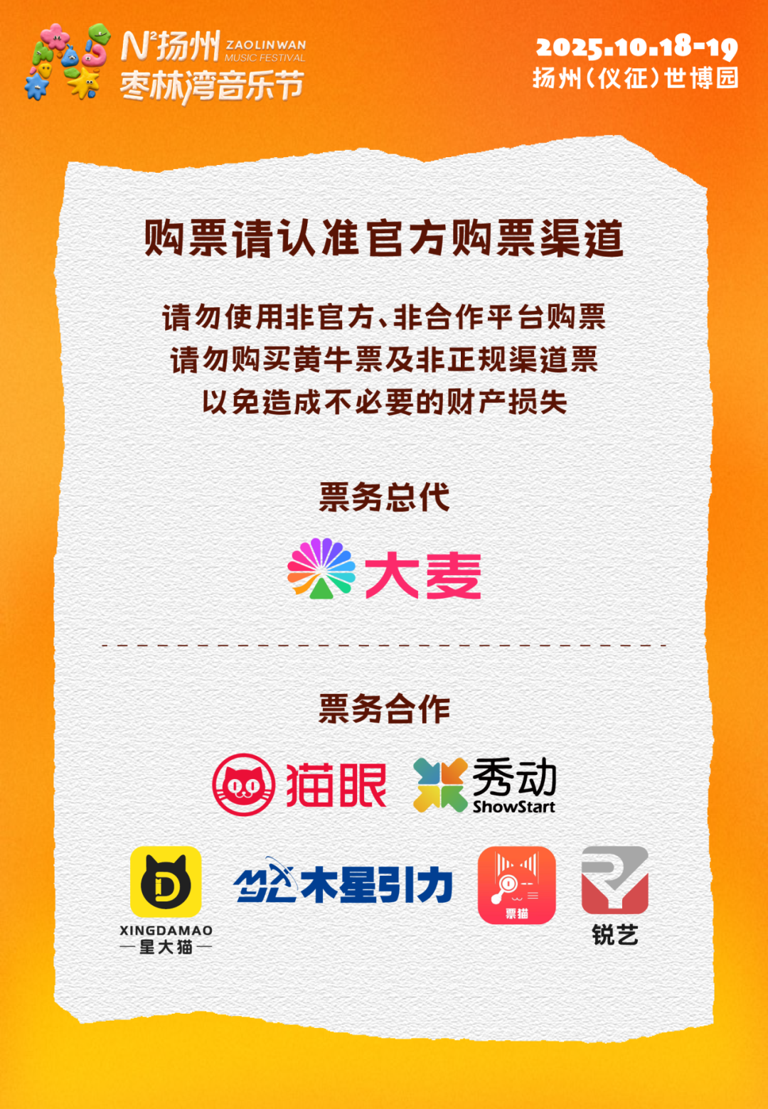 作为N²扬州枣林湾音乐节的主办单位,我们将尽一切努力为广大乐迷朋友提供一个公平有序的售票环境。在此也强烈呼吁购票人在官方售票渠道,按官方票务平台购票规则进行购票,感谢乐迷朋友们的理解与支持。