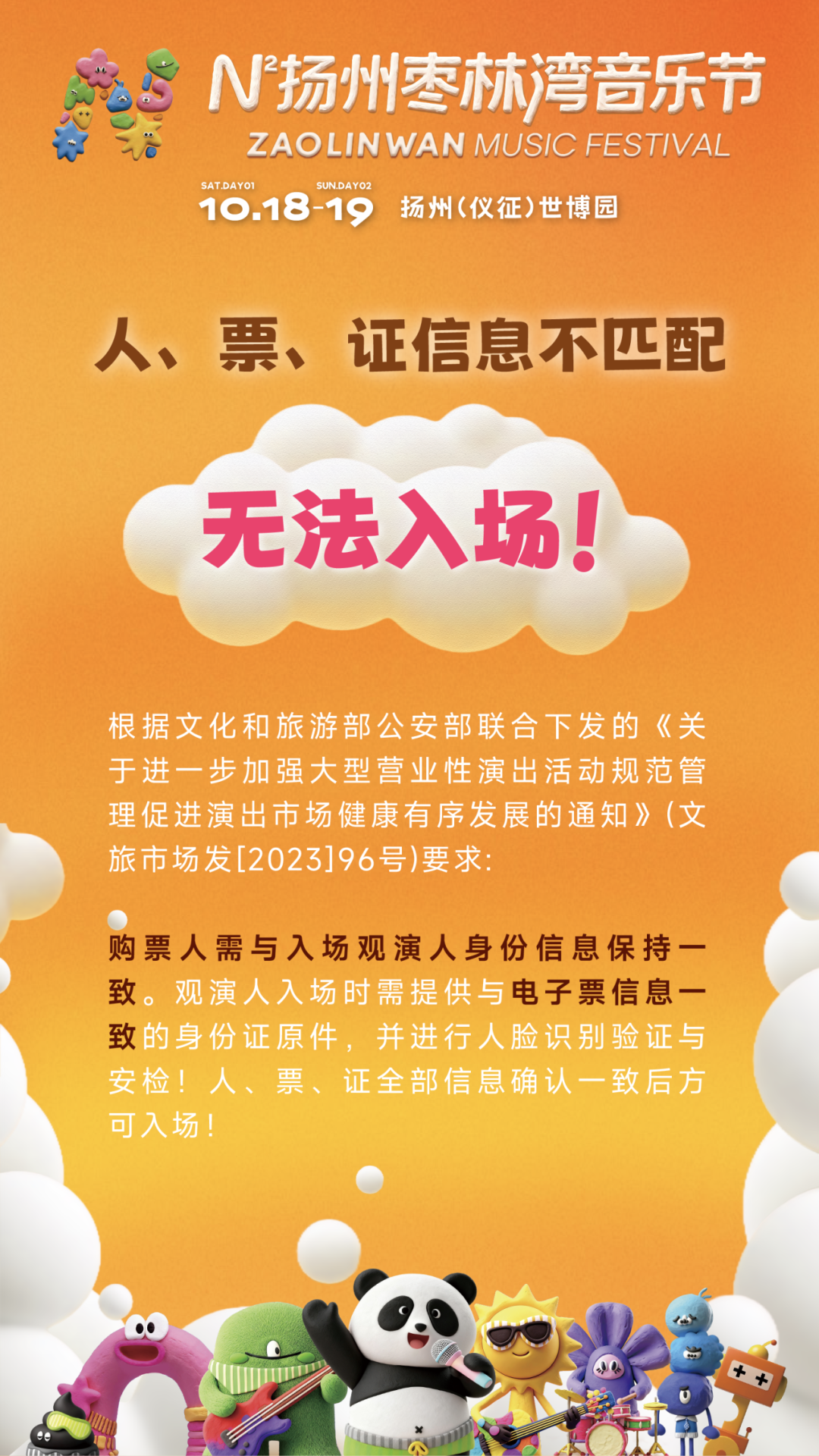N²扬州枣林湾音乐节将于2025年10月18日-19日在扬州(仪征)世博园举办。为了营造一个公平有序的票务销售与购买环境,让乐迷朋友能够拥有一个优质的购票及观演体验,特发布此票务须知,请您在购票前,仔细阅读此票务须知。本须知条款涉及您核心权益的部分会以下划线方式标注,请重点关注,若您不同意本须知中的相关条款,请立即停止购票,如对本须知有疑问,请联系相关购票平台客服人员进行咨询。