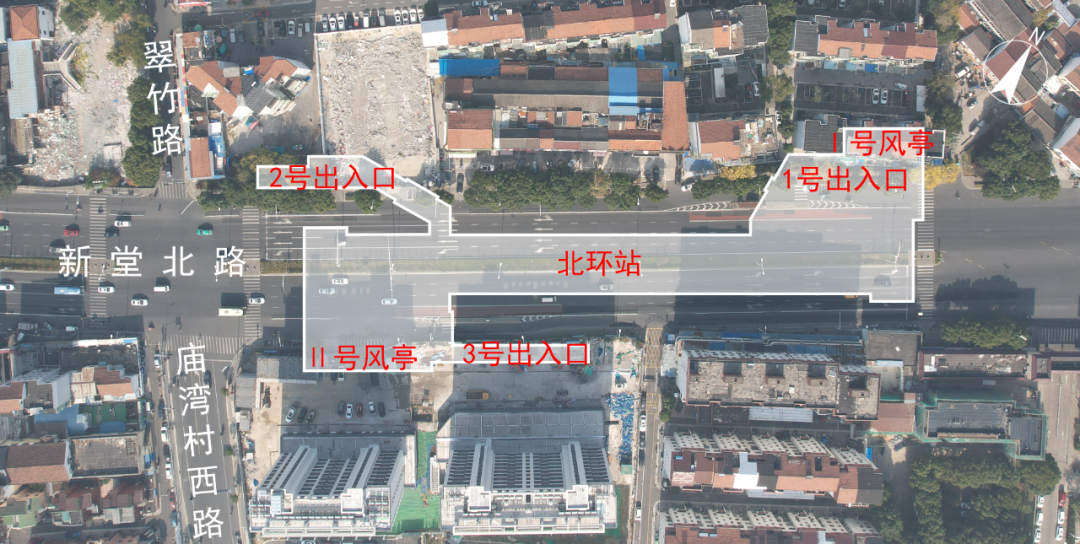 北环站位于新堂北路与翠竹路交叉口东侧,为地下二层岛式车站,车站总长190m,宽19.2m,共有2组风亭及3个出入口。
