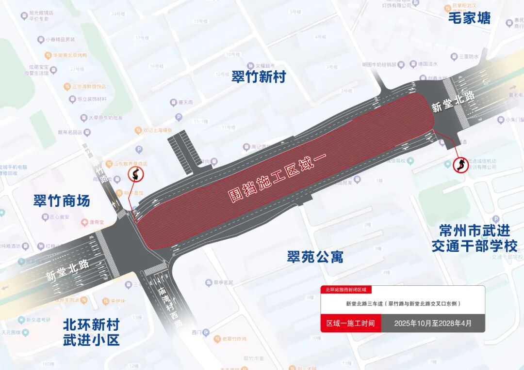 2025年10月14日至2028年3月31日,地铁5号线北环站主体结构施工,施工期间新堂北路与翠竹交叉口东侧部分路面封闭。