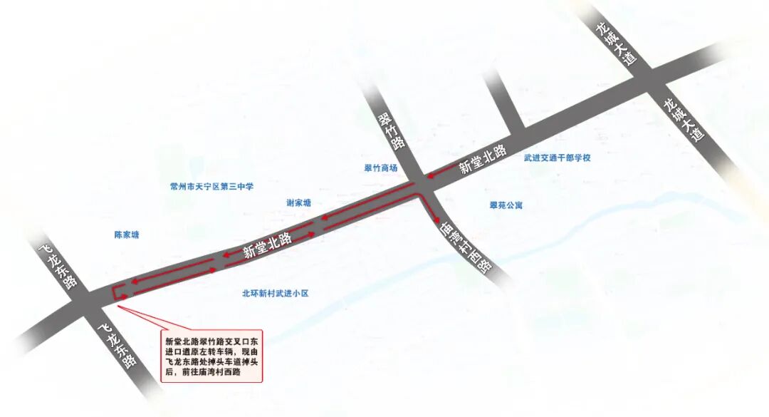 【新堂北路由东向西方向】保留1条直行车道、1条直右车道及非机动车道,原左转车道取消,禁止机动车在路口直接左转;直行、右转车辆及非机动车请按信号灯通行。需前往庙湾村西路方向的车辆,请直行通过路口后,在飞龙东路处掉头,再进入由西向东方向的右转车道驶入庙湾村西路。