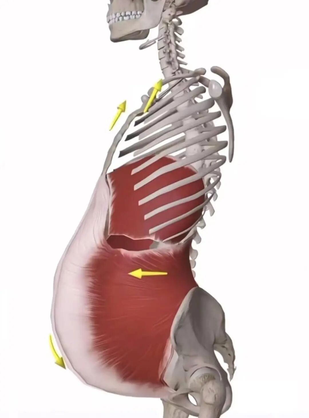 当胸腔和腹腔共用这层“蹦蹦床”时,就可能出现胸腔长期下压,挤压内脏位移空间,迫使腹部向前凸出的局面。