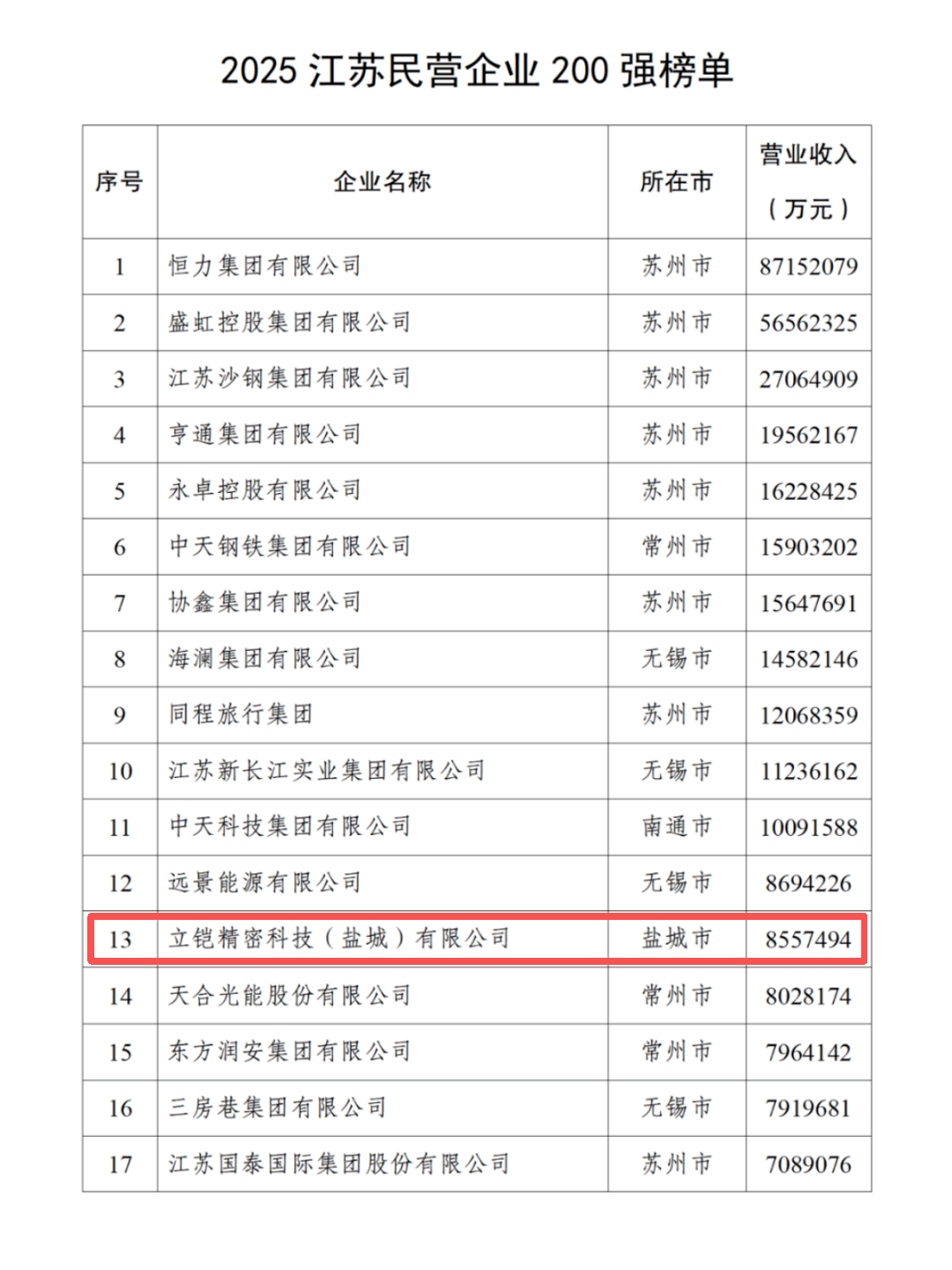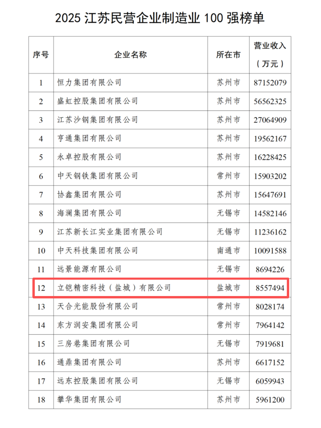 2025江苏民营企业百强公布,盐城这些企业上榜