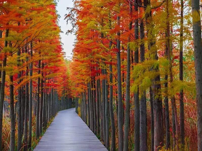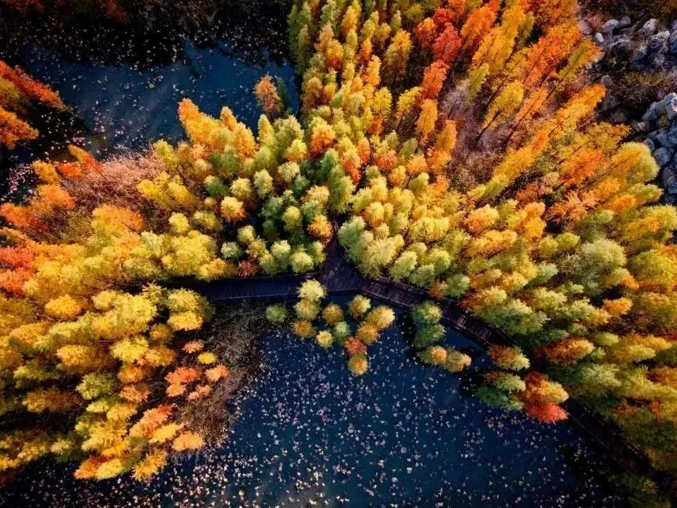 秋日的潘安湖池杉林里,已初步展现五彩斑斓的美态。游客沿着专属路线漫步打卡,来自山东枣庄的刘先生感叹:“第一次见这么美的池杉,随手一拍都是壁纸。很难想象,这里曾是徐州面积最大、生态环境恶劣的采煤沉陷区。”