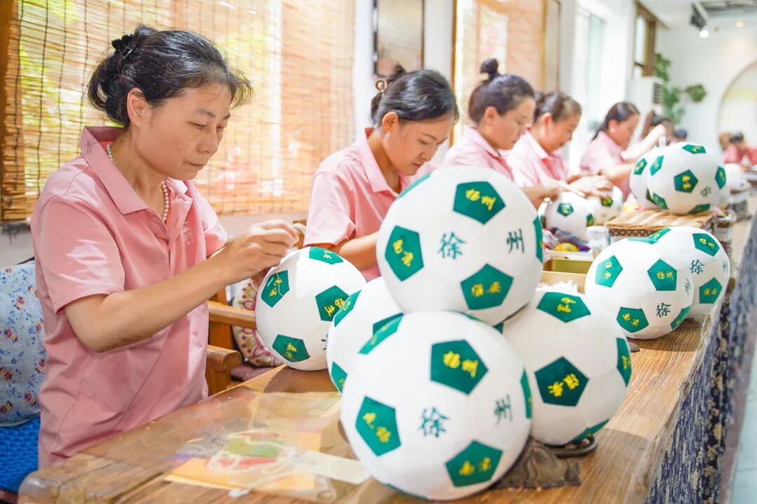 马庄香包,同样出彩。借势“苏超”,非遗焕发新活力。马庄香包文化大院内,绣娘们赶制“一定胜”足球香包,游客们参观制作过程,对形态各异的香包爱不释手。“今年1-9月香包全渠道销售额1442万元,与徐州报业传媒集团合作推出的‘苏超’主题足球香包销售额已突破40万元!”马庄村党委书记王侠展示着销售数据。