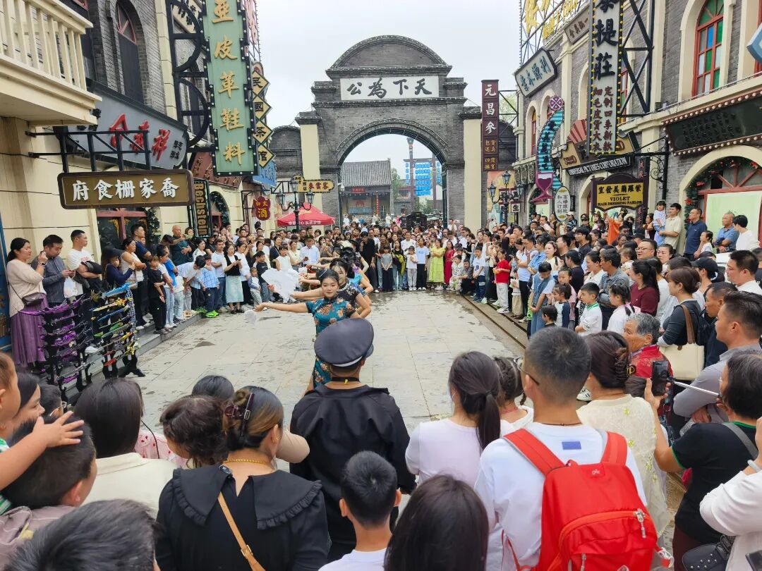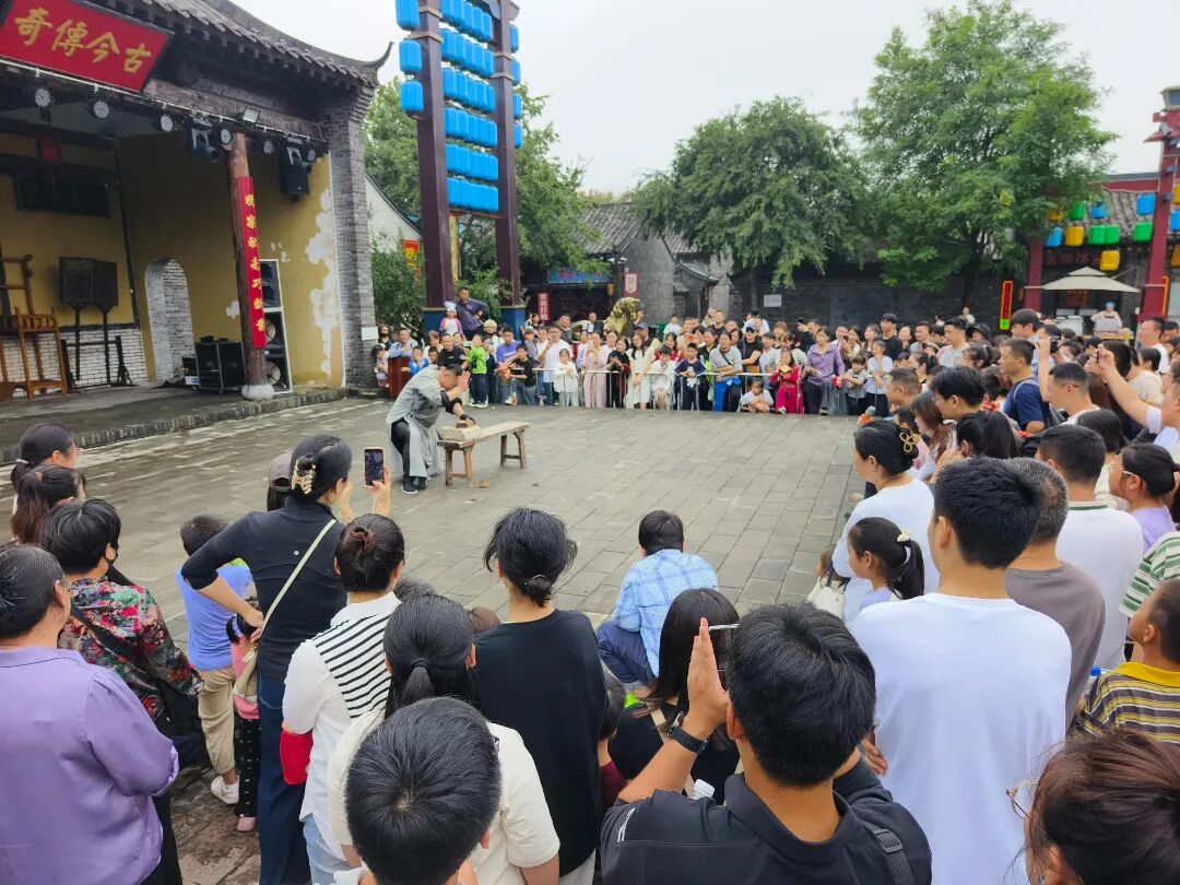 墨上集·拾光影城“一路有戏”国风主题活动中,20余名身着汉服的NPC(非玩家角色)穿梭街巷,让游客们沉浸式穿越“时光隧道”,街头情景短剧、非遗杂技轮番上演,每个人都是戏中主角,还能通过NPC互动赚取“银票”,更有全天70余场实景演艺无缝衔接,“招财进宝投铜钱”“欢乐敲锣”等传统小游戏让大人孩童重温乐趣。“没想到能在这里玩‘穿越’,猜灯谜、看光影秀,还能吃桂花糕,太有氛围感了!”大学生李萌萌笑着说。