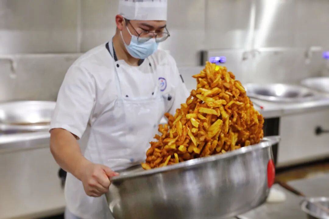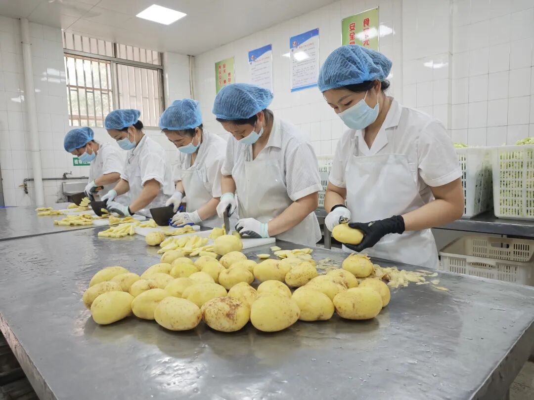 后厨里,孙师傅的动作熟得不能再熟:“土豆得选大的,皮儿薄肉嫩,洗干净切成条。”