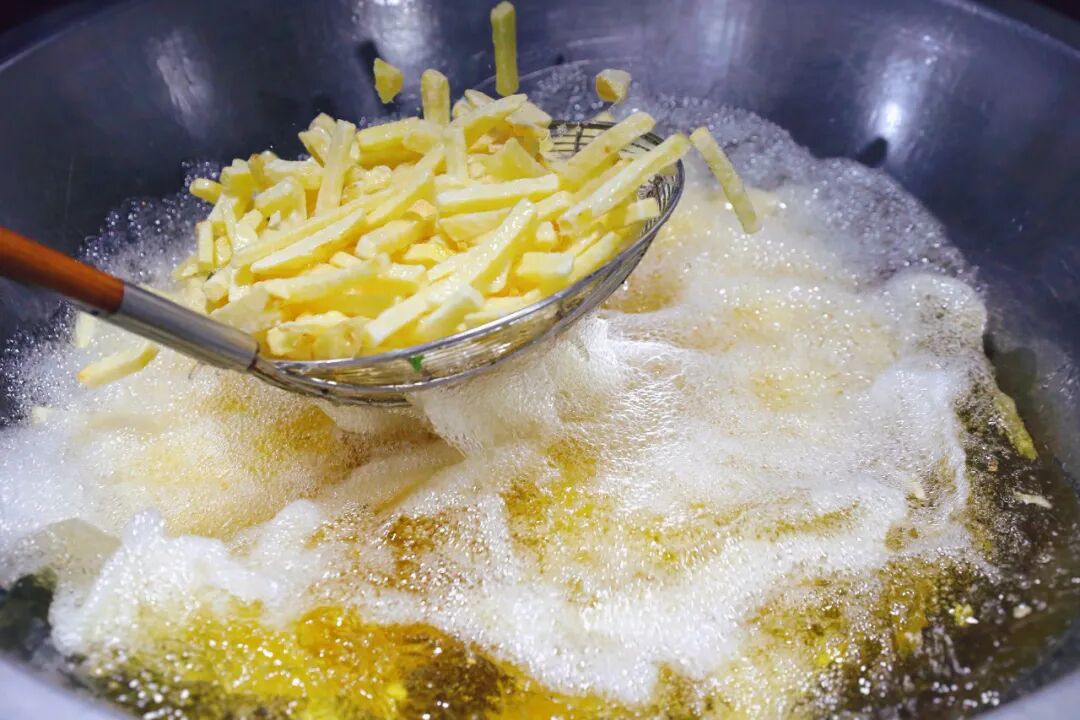 土豆条洗去淀粉后放进盐水里煮,煮沸一分钟后赶紧捞出来过冷水,“这样土豆条才脆!” 捞出来的土豆条,要“反复过2次凉水”(降温锁脆),沥干水分后倒在盆里,加玉米淀粉:“确保每根条都裹上薄粉,抖的时候不沾团”。