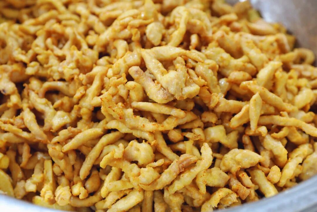 腌好后同样小火先炸:“先小火把浆裹牢,再大火炸到金黄,肉才嫩得爆汁!”关键的“灵魂一步”来了,撒椒盐粉!椒盐粉均匀撒在排条上,趁热拌匀:“一定要热的时候拌,椒盐才会粘在排条上,每一口都有味道!”