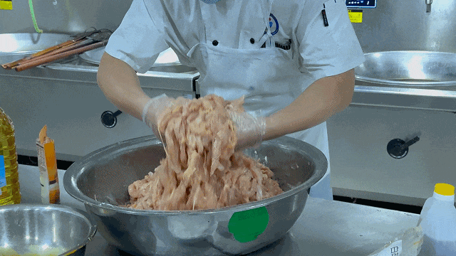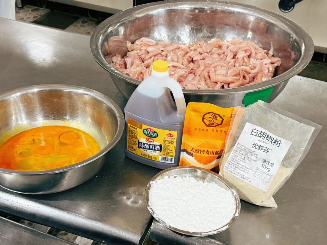 另一边的鸡胸肉也没闲着,切成手指粗的条,依次加进盐、料酒、鸡蛋、白胡椒粉——孙师傅边拌边笑:“这些料的量,我闭着眼都不会错,从2002年建校就这么调!”