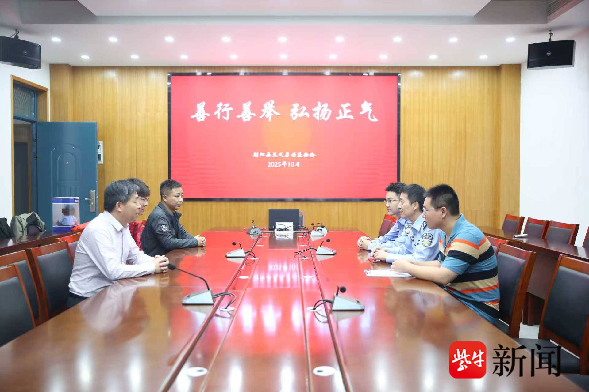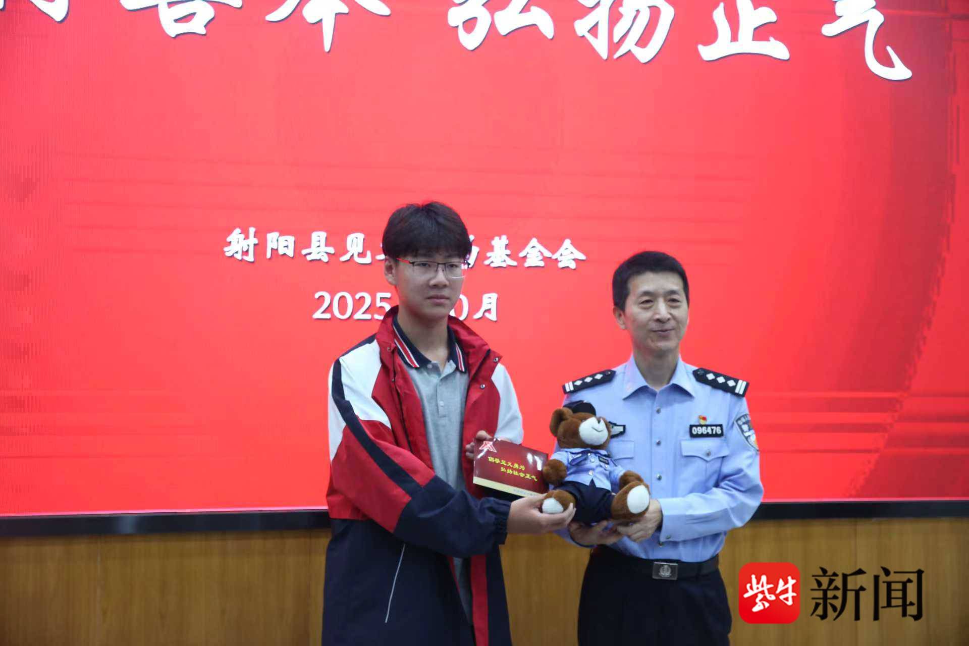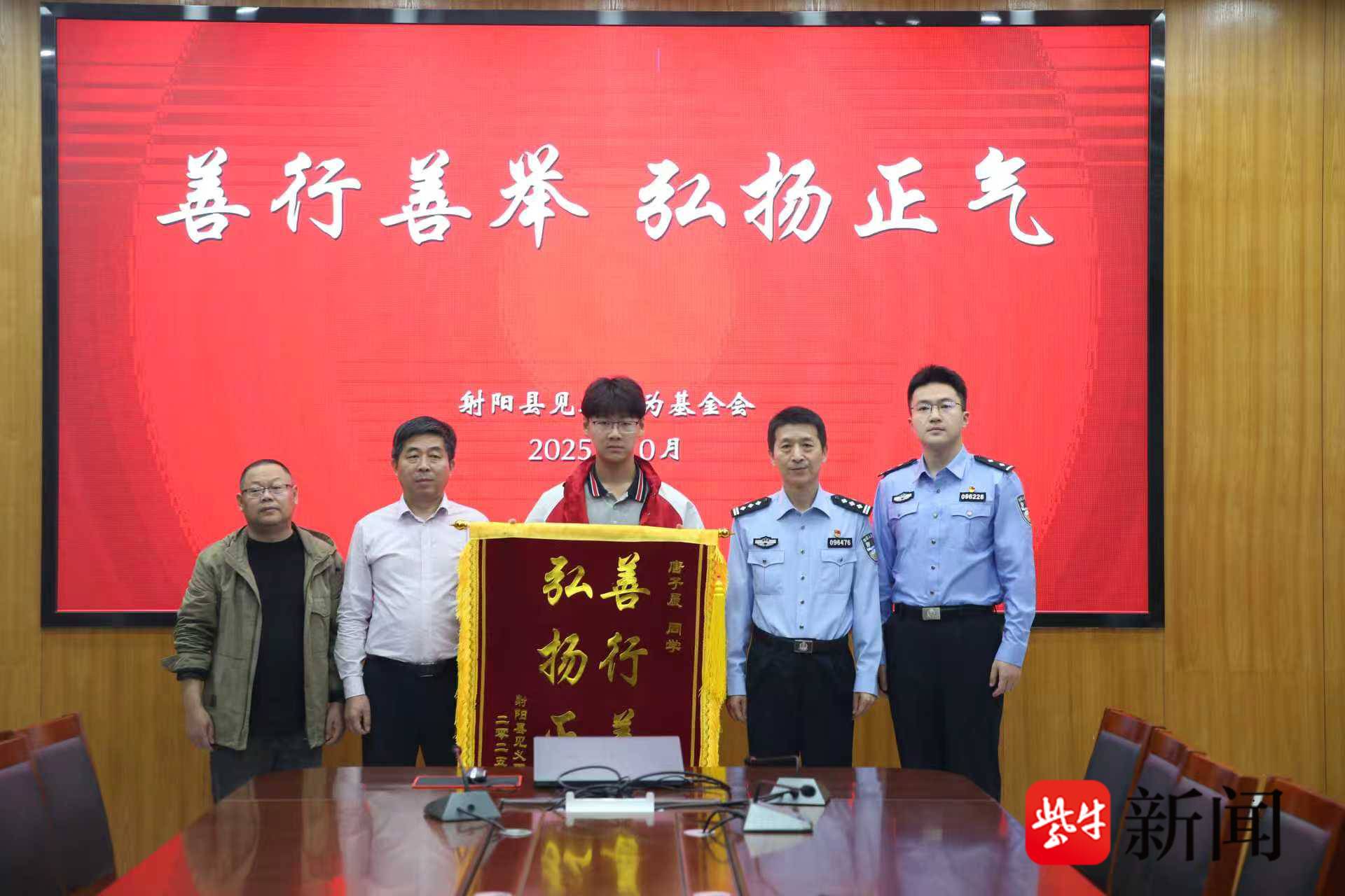善行义举,大爱人间。10月13日下午,盐城市射阳县见义勇为基金会一行专程来到射阳县第二中学,将一面书写着“善行善举 弘扬正气”的鲜红锦旗赠予16岁的唐子晨同学,对其在危急时刻挺身而出的行为表示高度肯定与赞扬,并鼓励他继续传递社会正能量。